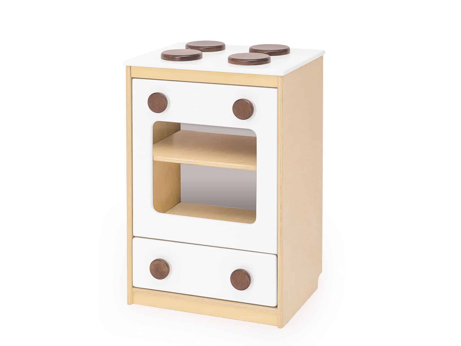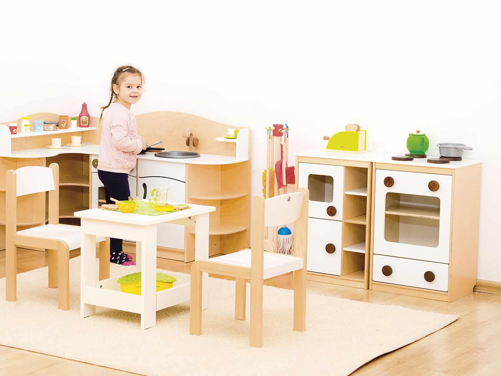 Et fuldt udstyret legekøkken er en rigtig fornøjelse for enhver førskolebørn, der vil bruge timer på at lege i det og spille de roller, de opfinder. De farverige elementer er lakeret med sikkerhedsgodkendt vandbaseret maling, som gør dem modstandsdygtige over for skår, slid, UV-stråler og de fleste kemikalier. Bagsiden af ​​skabene er lavet af hvid HDF. Fremstillet udelukkende af 12 mm krydsfiner, lakeret med økologiske vandlakker.