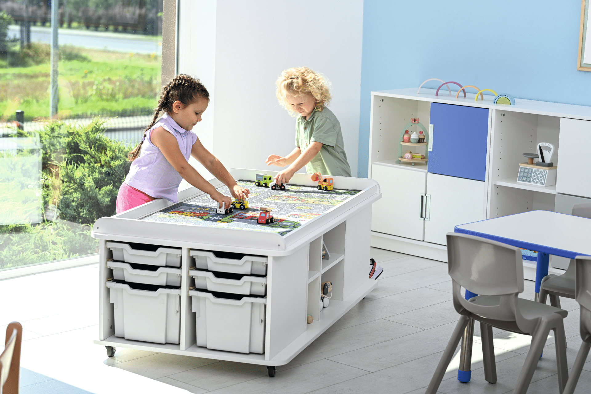 Skaber et levende legeområde med fokus på trafik og bevægelse.