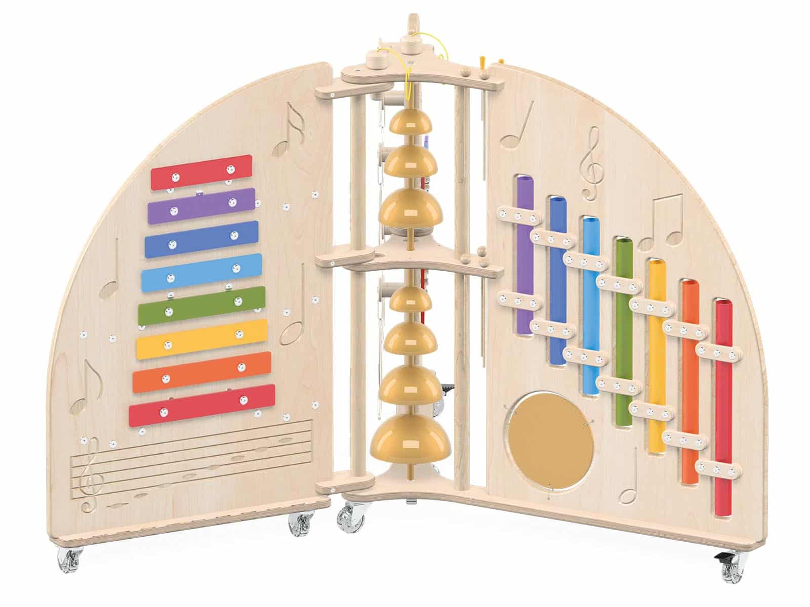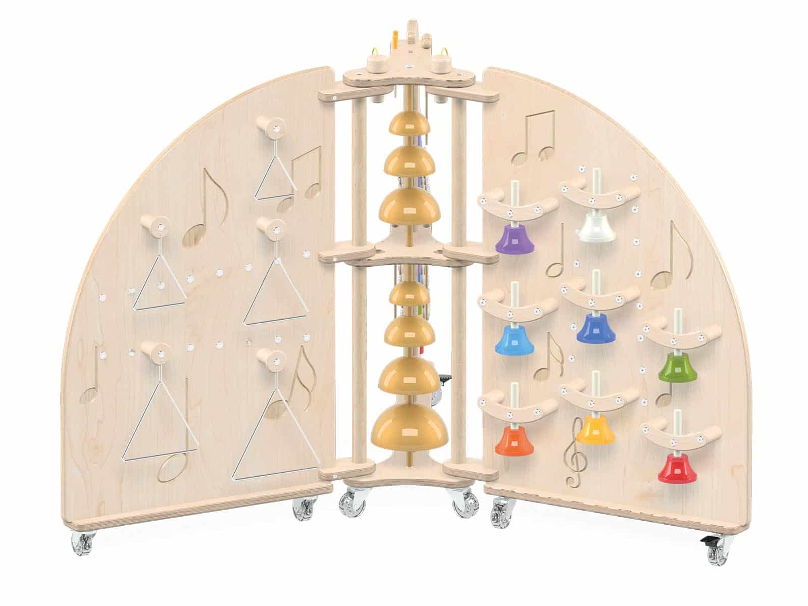 Paneler lavet af lakeret krydsfiner med en tykkelse på 18 mm. Musikøen er udstyret med 7 hjul, herunder 3 udvendige hjul med bremse. Klokker og klokkespil er pulverlakeret, hvilket garanterer ensartet og holdbar farvedækning.