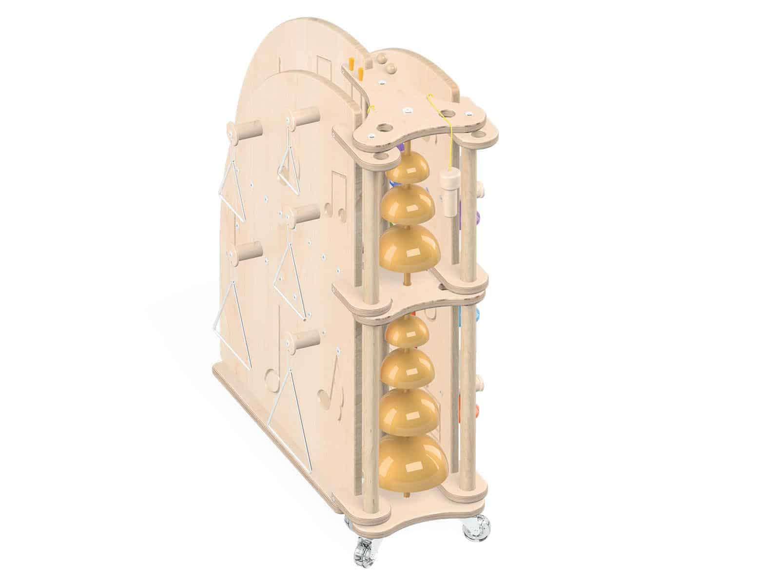 Integrerede klokkespil og rytmeinstrumenter monteret i møblet.