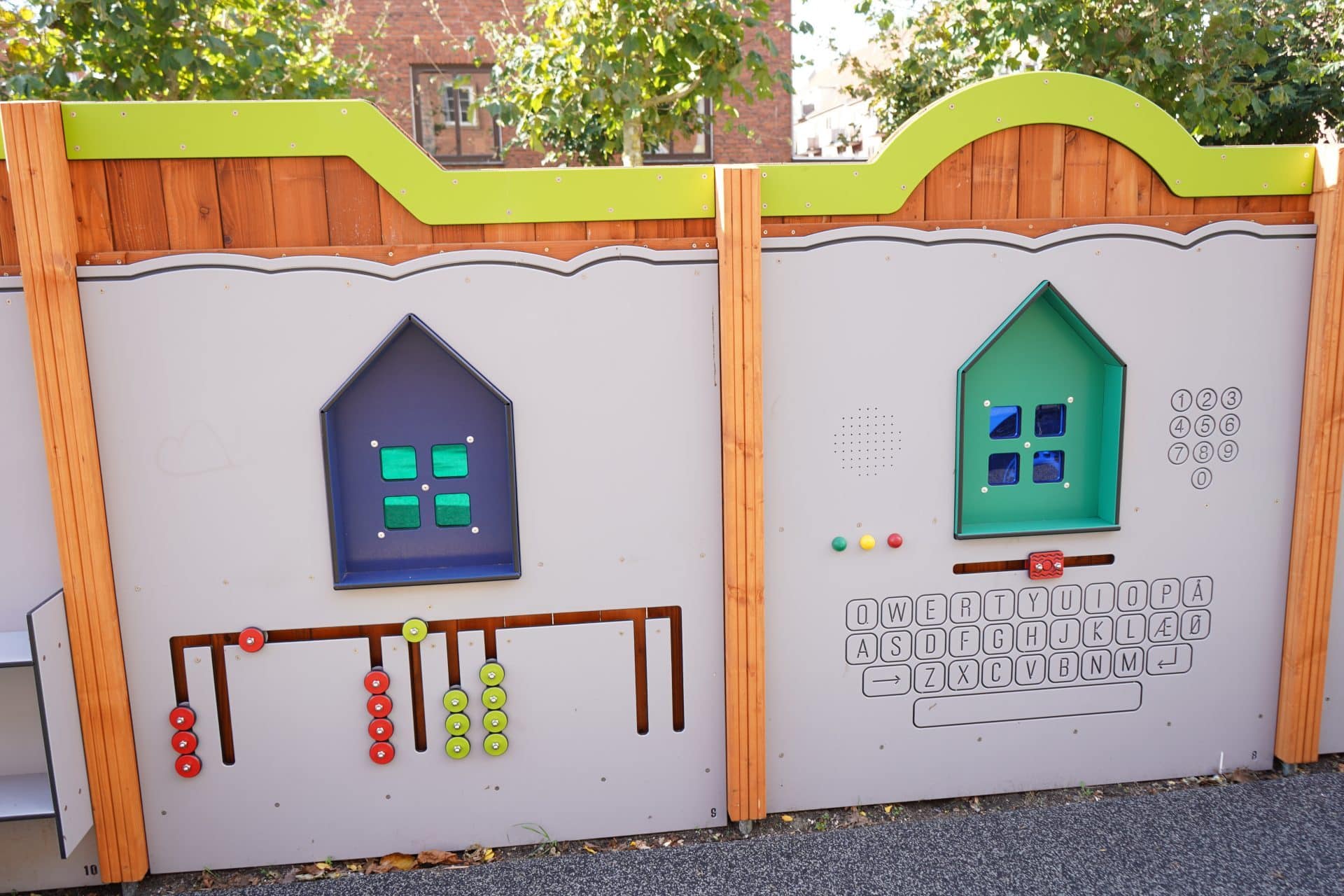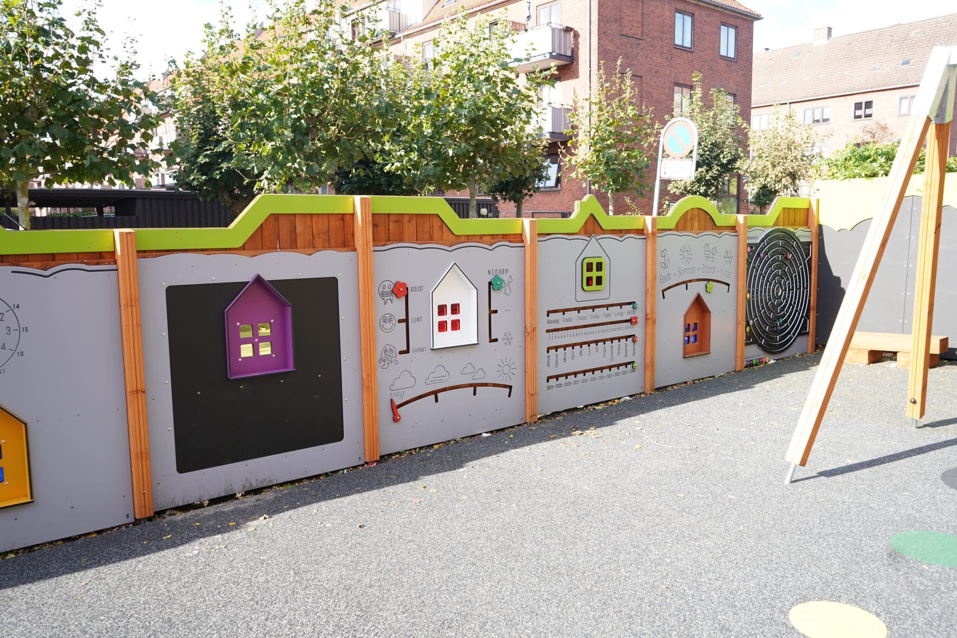 Da skolen ligger centralt i ”Fuglekvarteret” er plankeværket på ydersiden udsmykket med fuglehuse med farvet glas som giver kulørt farveindfald til legepladsen. På indersiden er der lavet en aktivitetsvæg som forstærker de aktiviteter børnene møder i undervisningen i 0. klasse. Bagerst på legepladsen er en kæmpe tegnevæg/kridttavle som giver mulighed for en konstant foranderlig leg hvor der kan laves spil lege eller hvor børnene kan udfolde sig kreativt. PlanLeg har også leveret læringstavler med ”100 hyppigste danske ord” og ”Matematik i naturen”.